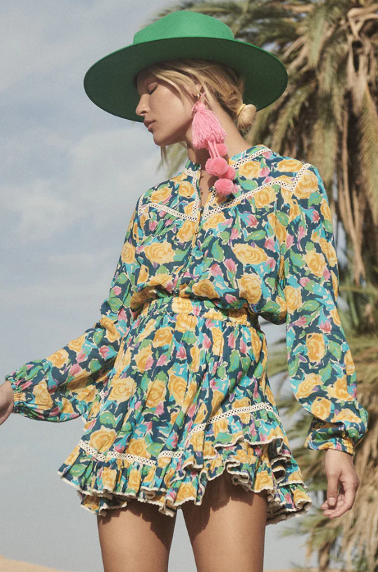 With its airy 50/50 blend, the Flora Blouse in Mystic caresses the skin while enhancing your fit with a touch of everyday elegance. Like Spell's beloved Dolly Blouse, this one has billowing sleeves, an elastic cuff on the sleeves, and gathers at the neck. Perfect for an elegant print-on-print look when paired with Spell’s Flora Pant, or dress her down with any of their Eve Denim and boots for an off-duty look. 50% LENZINGTM ECOVEROTM Viscose and 50% Organic Cotton were used in its creation as well as the Elastic wristband and front button covered with fabric. Buy Now!
